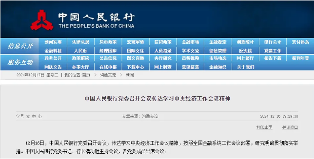中国人民银行官网消息,12月16日,中国人民银行党委召开会议,传达学习中央经济工作会议精神,按照全国金融系统工作会议部署,研究明确贯彻落实举措。中国人民银行党委书记、行长潘功胜主持会议,各党委成员出席会议。