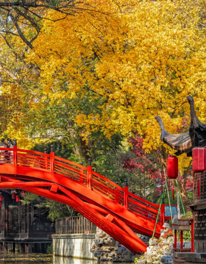 5、瘦西湖:秋季的瘦西湖色彩斑斓,青柳、红枫、银杏交织成一幅绝美画卷!