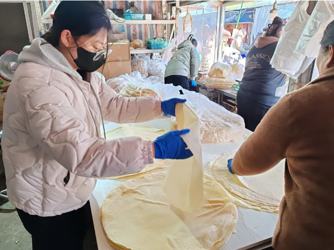 春节期间,记者走访了山东省泰安市多家煎饼加工企业,煎饼生产车间正热火朝天、加班加点地开工。相比过去需要人守在鏊子前一张张摊煎饼的传统制作方法,现在采用机器自动摊煎饼,效率更高,煎饼的口感质量也稳定。